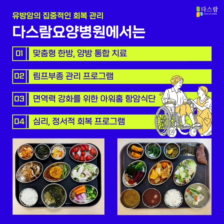 다스람요양병원에서는 유방암 수술 이후 환자분들의 전이 여부 확인과 면역 회복 관리를 위해 통합암면역치료를 시행하고 있습니다. 표준암치료 과정과 더불어 치료의 효율을 높여주고, 항암치료로 인한 부작용을 완화하기 위한 보조치료인 샘인데요, 암세포 전이를 예방하기 위한 면역력과 영양관리에 도움을 드리고 있답니다.