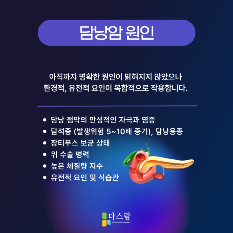 담낭암은 앞서 말씀드렸듯이 하나의 원인만으로 발생하기보다는, 오랜 기간 담낭에 염증이나 자극이 반복되면서 세포가 비정상적으로 변하는 과정에서 생기는 질환이에요. 이 외에도 아래와 같은 여러 요인들이 담낭암의 발생에 영향을 미칠 수 있습니다.