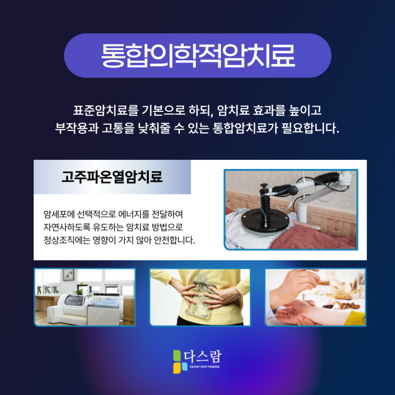 다스람요양병원에서 시행하는 통합의학적 암치료 중 하나인 고주파온열암치료는 암세포에만 선택적으로 에너지를 전달하여 온도를 높임으로써 암세포의 사멸을 유도하는 치료법인데요.