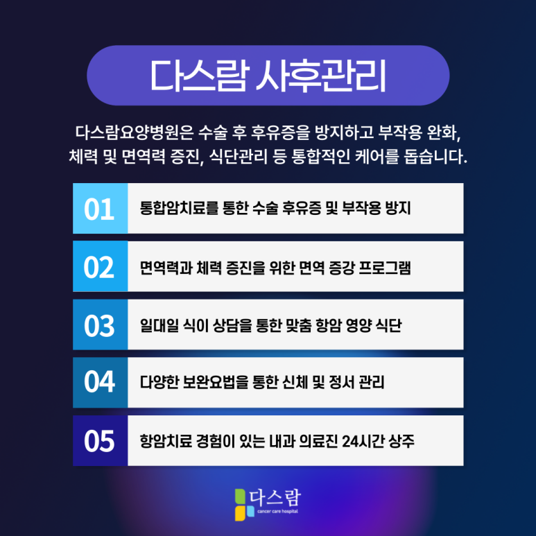 다스람요양병원에서는 수술·항암·방사선치료 이후의 회복기를 돕기 위해 통합의학적 암치료 프로그램을 통해 환자분들이 신체적·정신적으로 안정된 상태로 건강을 회복할 수 있도록 함께하고 있습니다.