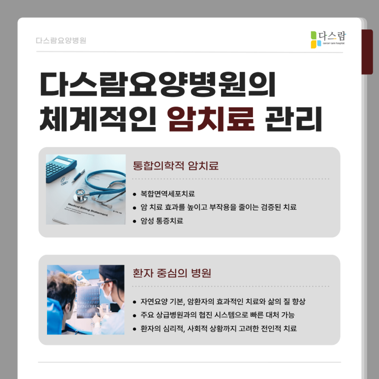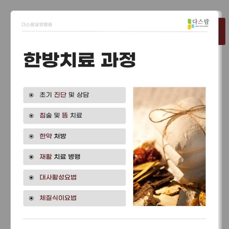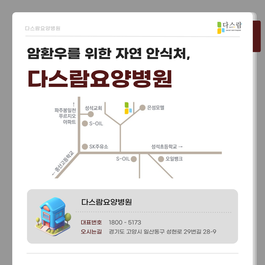 강서암요양병원 다스람병원에서는 양방 치료와 한방 치료를 함께 적용하는 통합 케어를 통해 암 환자 한 분 한 분의 상태에 맞는 세심한 회복 관리가 이루어지고 있어요. 치료 이후의 회복이 막막하게 느껴지신다면, 의료진과 함께 몸의 균형을 바로잡는 방법을 고민해보시길 바랍니다.