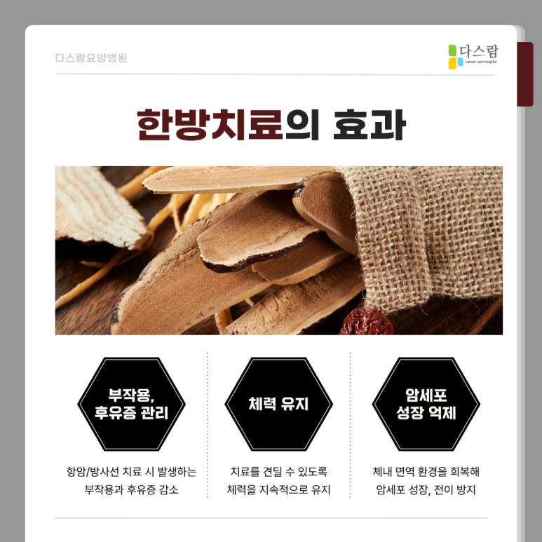 암 치료는 종양을 제거하는 것에서 끝나는 것이 아니라, 치료로 인해 약해진 몸의 균형을 다시 세우는 과정이 무엇보다 중요합니다. 한방치료는 바로 이 회복 단계에서 환자분들의 체력과 면역력을 끌어올리고, 항암·방사선 치료로 생긴 불편함을 완화해 더 안정적인 일상 복귀를 돕는 치료입니다.