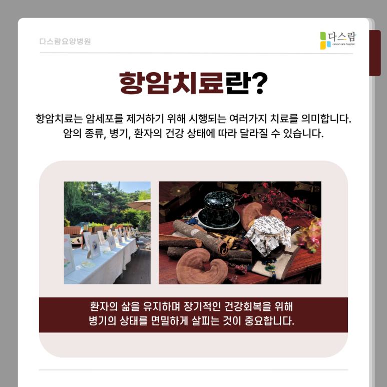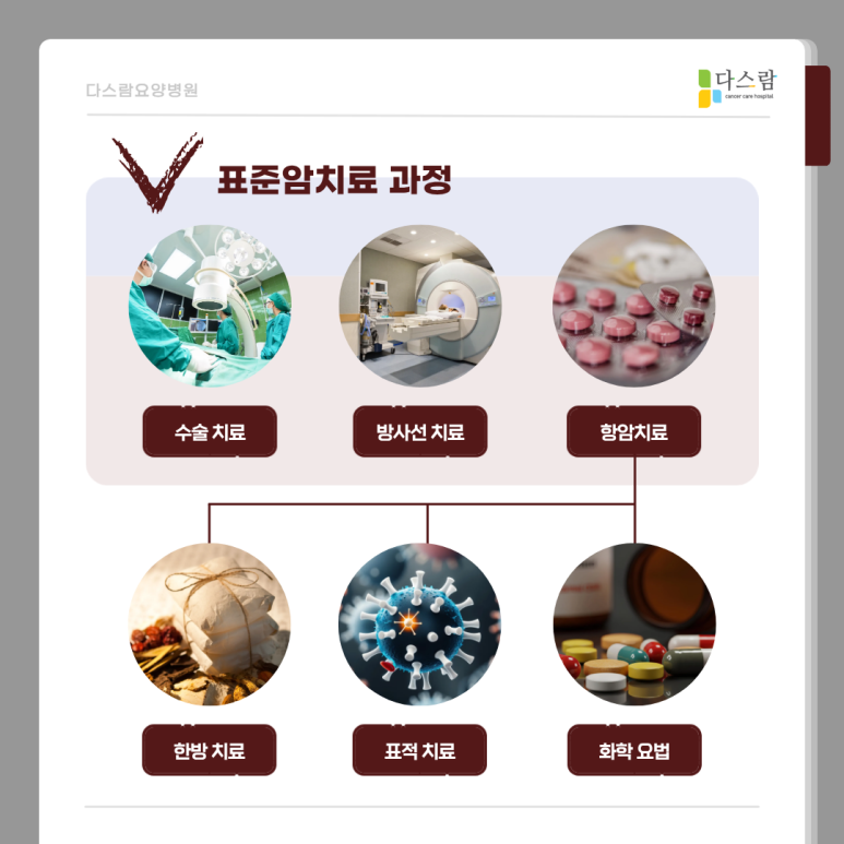 물론 표준치료가 암을 제거하는 데 중요한 역할을 하지만, 그 과정에서 발생하는 후유증까지 책임지기는 어려운 편이에요. 그래서 강서암요양병원 다스람병원에서는 표준치료의 공백을 채워주는 통합암치료를 시행하고 있는데요 한방치료, 표적치료, 화학요법 등으로 구성되어 있어요.