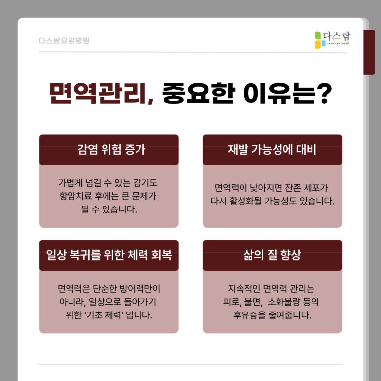 면역력이 약해지면 치료 효과가 충분히 유지되지 못하거나, 회복 속도가 더뎌져 일상 복귀가 어려워질 수 있기 때문에 항암 이후의 면역관리야말로 ‘치료의 연장선’이라고 볼 수 있어요.