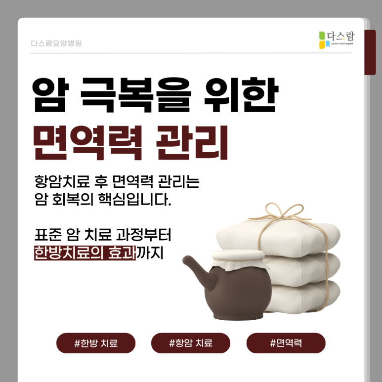 강서암요양병원 다스람병원에서는 환자의 상태를 함께 평가하여 다양한 한방치료를 적용하고 있는데요. 오늘은 항암치료 후 면역력이 왜 중요한지, 그리고 한방치료가 어떤 방식으로 회복을 돕는지 차근차근 알려드릴게요.