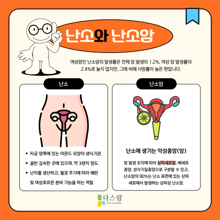 난소암은 이런 난소에 생기는 암을 말하는데요. 암이 발생하는 조직에 따라 상피세포암과 배세포종양, 그리고 성삭기질종양으로 구분할 수 있어요. 난소암의 90%는 난소 표면에 있는 상피세포에서 발생하는 상피성 난소암입니다. 또 세포 형태에 따라 장액성 난소암, 점액성 난소암, 자궁내막양 난소암, 투명세포암, 그리고 드물게 악성 브레너 종양으로 나누어 질 수 있어요.