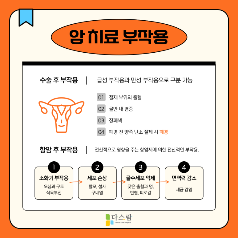 난소암 역시 다른 암과 마찬가지로, 암 치료의 부작용과 면역력 저하에 신경을 써야 합니다. 수술 후에는 절제 부위의 출혈이나 골반 내 염증, 장폐색과 같은 급성 부작용이 나타날 수 있으며, 폐경 전 양쪽 난소 절제술을 시행했다면 폐경이 초래될 수 있습니다.