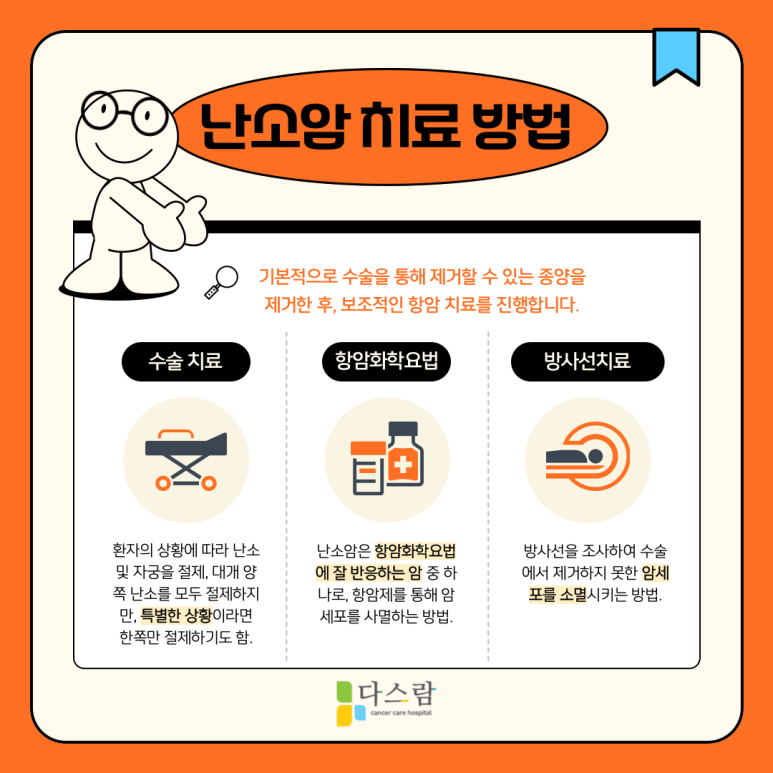 수술 치료 이후에는 항암화학요법과 방사선 치료, 표준암치료를 시행하며, 특히 난소암은 항암화학요법에 비교적으로 잘 반응하는 암 중 하나에요.