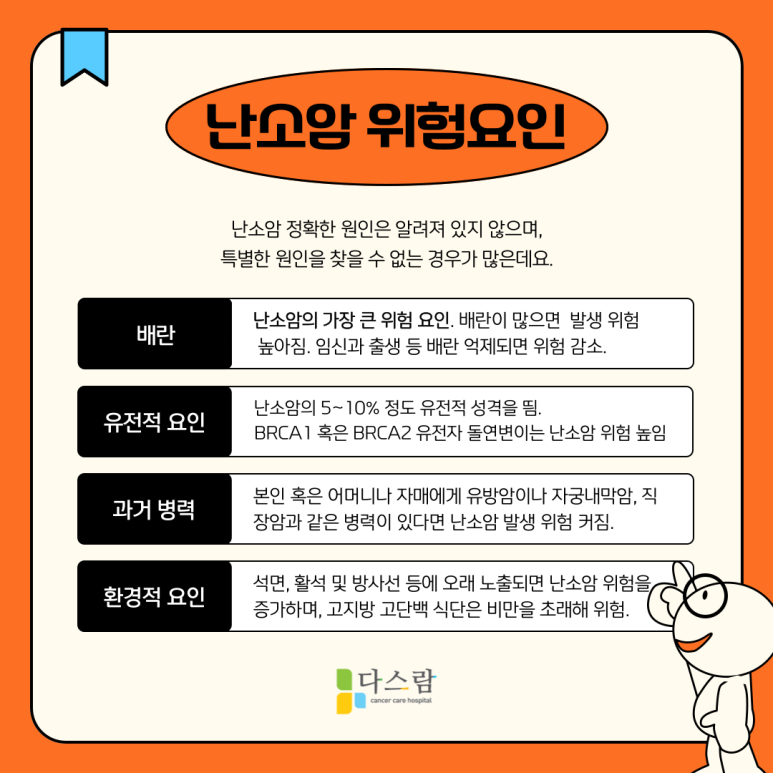 난소암 또한 정확한 원인은 알려져 있지 않으며, 특별한 원인을 찾을 수 없는 경우가 많은데요. 심지어 난소암은 가족력이 없어도 발생하는 경우가 95% 정도로 대부분을 차지하고 있기 때문에 정기적인 검진을 통해 난소암 고위험군인지 아닌지를 확인하는 과정이 필요할 수 있습니다. 난소암의 위험요인으로는 배란과 유전요인, 질병 과거 이력 등을 들 수 있어요.