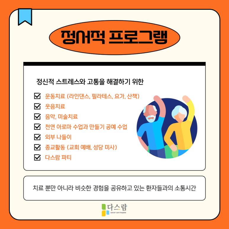 특히나 난소암은 여성에게만 발생하는 암이며, 폐경을 초래하기도 하는 만큼 환자의 여성성에 따른 심리적, 정신적 고통을 안고 계실 수 있습니다. 파주암환자요양병원 다스람요양병원에서는 육체적 고통을 감해주는 치료 뿐만 아니라, 정신적인 스트레스와 고통의 문제를 해결해드리기 위한 다양한 정서적 프로그램을 제시합니다.
