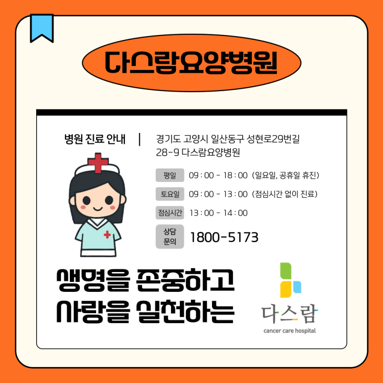 비슷한 경험을 공유하고 있는 많은 분들과 소통하며, 서로를 이해하고 보듬어줄 수 있는 시간을 만들기 위해 노력하고 있으며, 입원하고 계시는 동안에는 어떠한 불편함 없이 쾌적하고 즐겁게 지내실 수 있도록 노력하는 파주암환자요양병원 다스람요양병원이 되겠습니다.