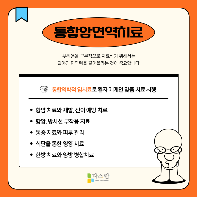 이러한 부작용을 근본적으로 치료하기 위해서는 떨어진 면역력을 끌어올리는 것이 중요하며, 이를 위해 파주암환자요양병원 다스람요양병원에서는 다양한 통합암면역치료 프로그램을 구성하고 있습니다.