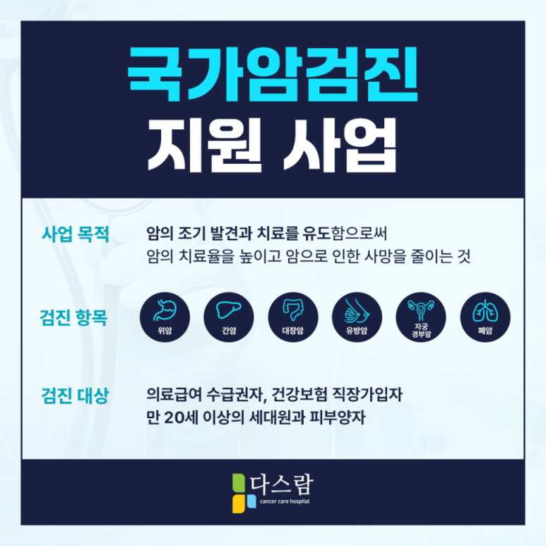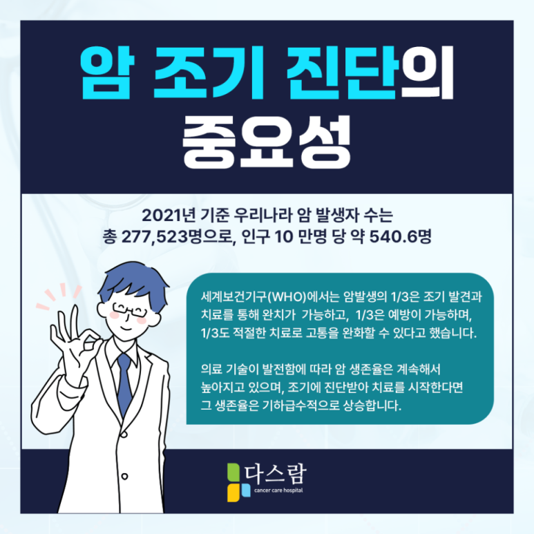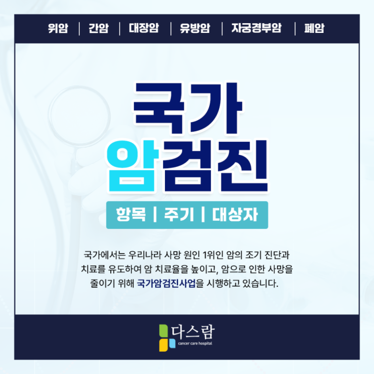 특히, 초기에는 별다른 증상이 동반되지 않는 경우가 많아 인지하기 어려운 질환인 암은 생명과 직결되어 있어 보다 주의를 할 필요가 있었는데요. 오늘 고양암치료병원 다스람요양병원에서는 이를 조기 발견하기 위한 국가암검진에 대해 알아보도록 하겠습니다.