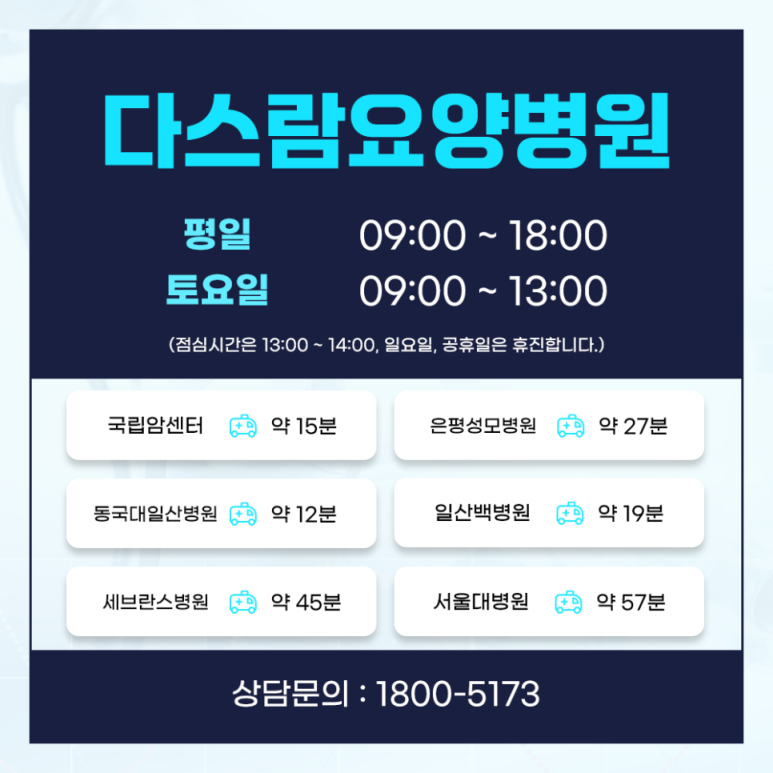 이를 위해 고양암치료병원 다스람요양병원에서는 표준암치료에 대한 효과를 높이고 나타날 수 있는 부작용 및 후유증을 완화하기 위한 통합의학적암치료와 함께 맞춤 케어를 병행하고 있으며, 혹시 모를 응급상황에 대비하고 있습니다.