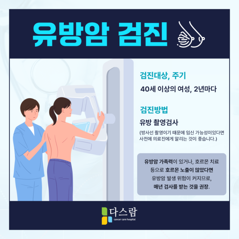 40세 이상 여성이라면 2년 주기로 유방촬영술을 국가암검진을 통해 진행을 하고 있는데요. 해당 연령이 아닌 경우라도 30세에서 35세는 매달 자가검진을, 35세라면 2년 주기로 전문의의 진찰을 진행하는 것이 좋다고 해요.