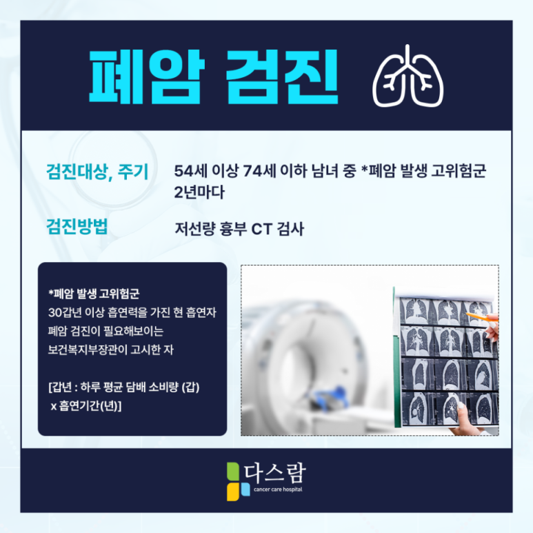 또한, 빠른 진단을 받을수록 치료의 가능성이 높아진다고 하는데요. 이 때 흉부CT 검사를 통해 진행을 하게 된다고 하며, 만 54세에서 74세 고위험군에 속한다면 2년 주기로 검진을 받아보는 것이 필요하다고 합니다.