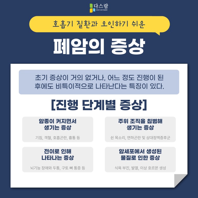 - 기침이나 객혈, 호흡곤란 및 흉통 등: 해당 증상의 경우에는 암종이 커지면서 발생할 위험이 높아집니다.