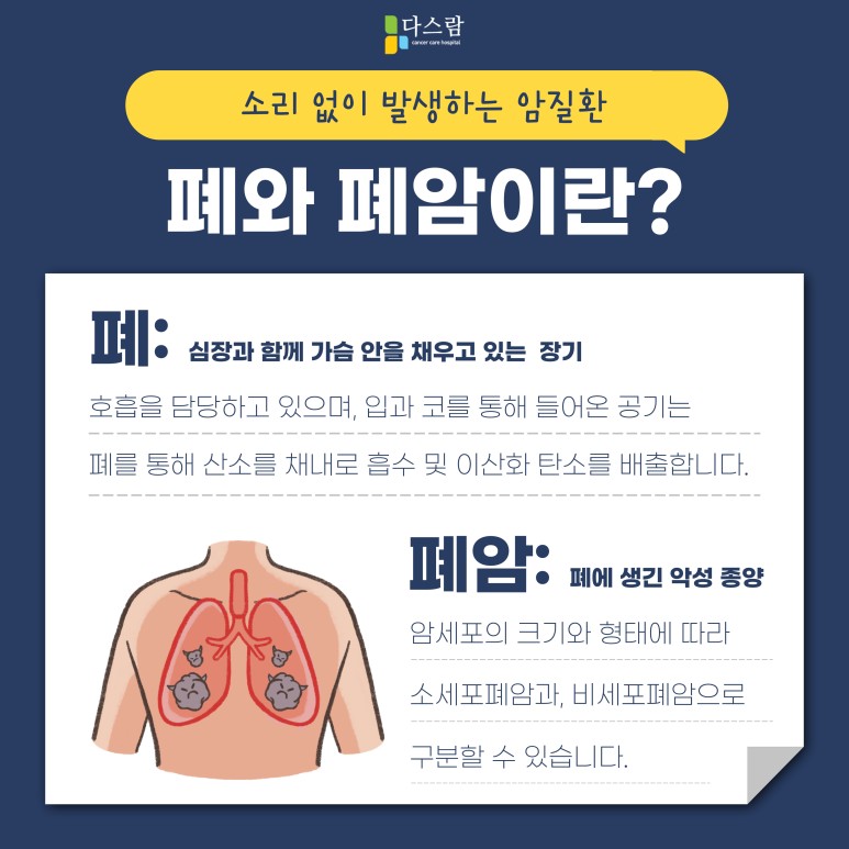 오늘 고양암재활병원 다스람요양병원에서는 폐암에 대한 설명과 함께 위험요인에 대해서 설명 드리도록 하겠습니다. 최근 의료기술이 발달하며, 암을 진단받은 경우라도 좋은 예후를 기대할 수 있기 때문에 초기에 적극적인 대처를 하는 것이 중요하다고 해요.