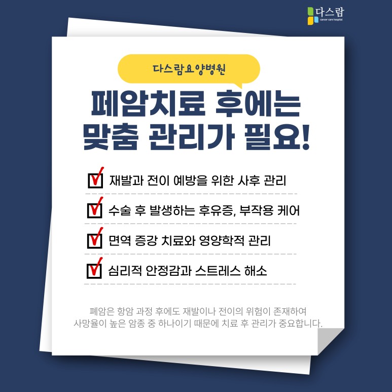 폐암치료 후 나타날 수 있는 통증관리부터 항암치료 부작용 등의 관리 그리고 저하될 수 있는 면역력 등에 관하여 암성 통증관리와 면역 증강 치료 그리고 암종 및 개개인의 상태에 맞는 항암식단을 통한 고른 영양소 섭취가 필요할 수 있다고 해요.