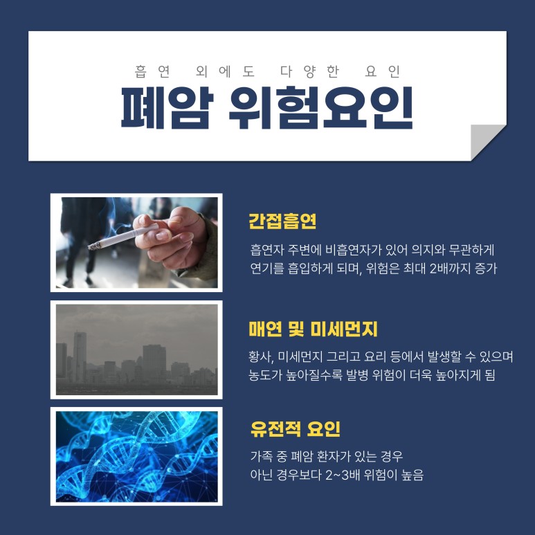 봄철에 발생하게 되는 황사나 미세먼지 등도 영향을 줄 수 있는데요. 세계건강보건기구에서 1급 발암물질로 지정되었을 뿐만 아닌 초미세먼지의 농도가 높아질수록 위험도가 더욱 증가한다는 연구결과까지 있다고 해요. 이 외에도 가족력과 같은 유전적 요인이나 직업 등이 영향을 줄 수 있어요.